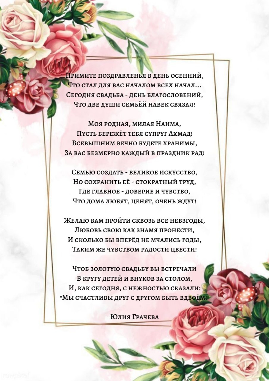 Привет! Меня зовут Юлия Грачева. Пишу эксклюзивные стихи, песни и поздравления на заказ для самых ярких моментов вашей жизни: свадьбы, конкурсы, дни рождения.